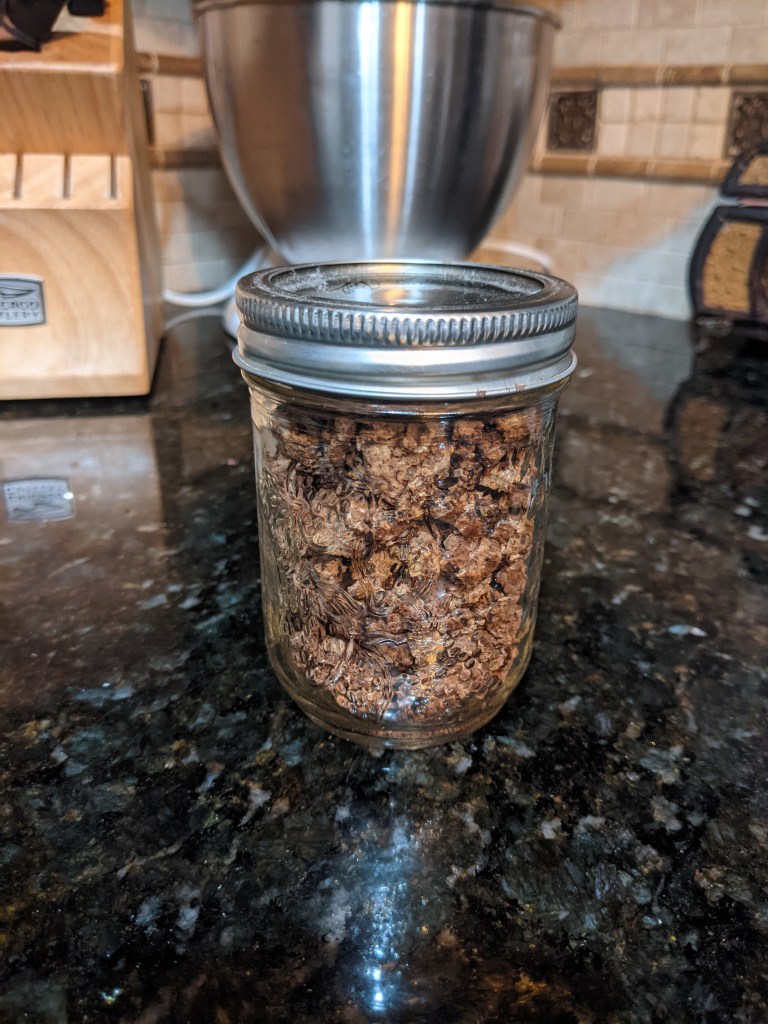 Once the hamburger is dehydrated (and you’ll know if done when it looks like little brown pebbles) put in clean jars along with an oxygen absorber pack and BAM! – Hamburger Rocks!